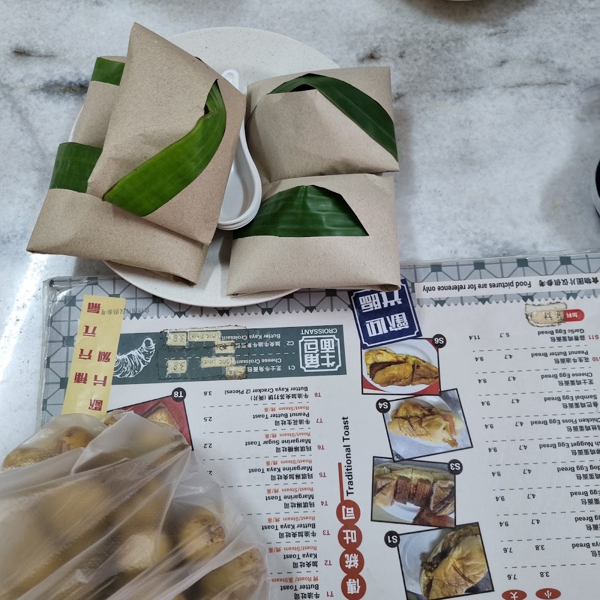 - Snacks and Light Bites: Items like butter kaya crackers, kaya wholemeal buns, putu mayam, and otak egg bread.